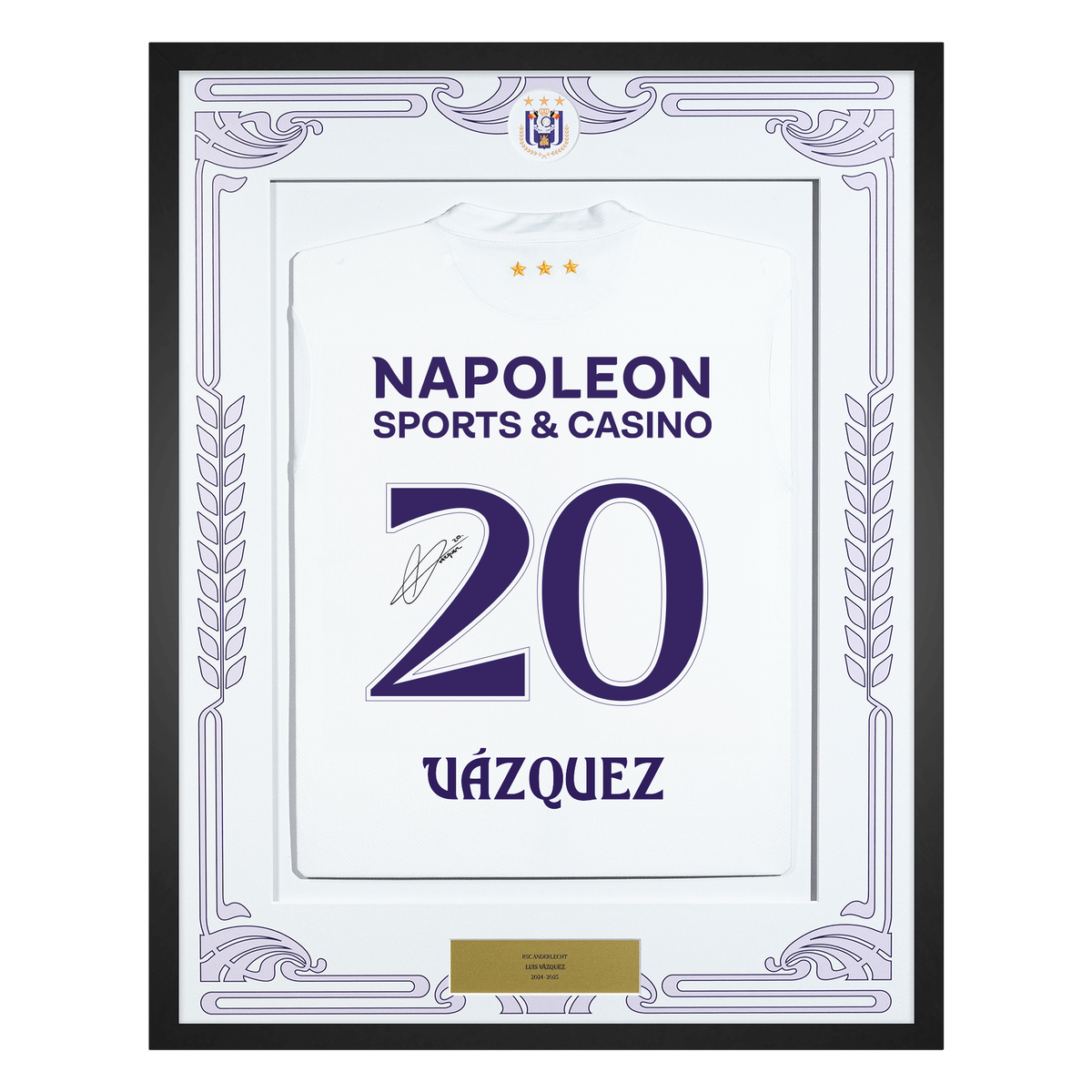Framed and signed official away shirt of your favorite player. A stylish, elegant design with a plaque engraved of the club's name, followed by the player's name and the current season. Dimensions : 87.5cm x 68 cm. Weight : 6kg. Important note: The delivery time for this item is 15 to 20 days. The framed jersey will be delivered separately from the other items ordered. No discount applies on this item. “Each signature is unique and authentic, the product you receive may differ from the one shown above.”