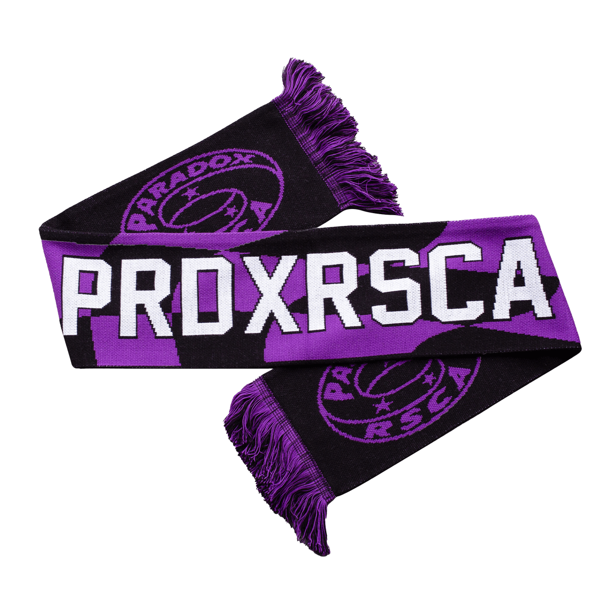 Mauve and black scarf with a marked and structured checkered pattern across the entire piece, combining the “PRDXRSCA” lettering in the center, and integrating the RSCA initials into the Paradox logo.