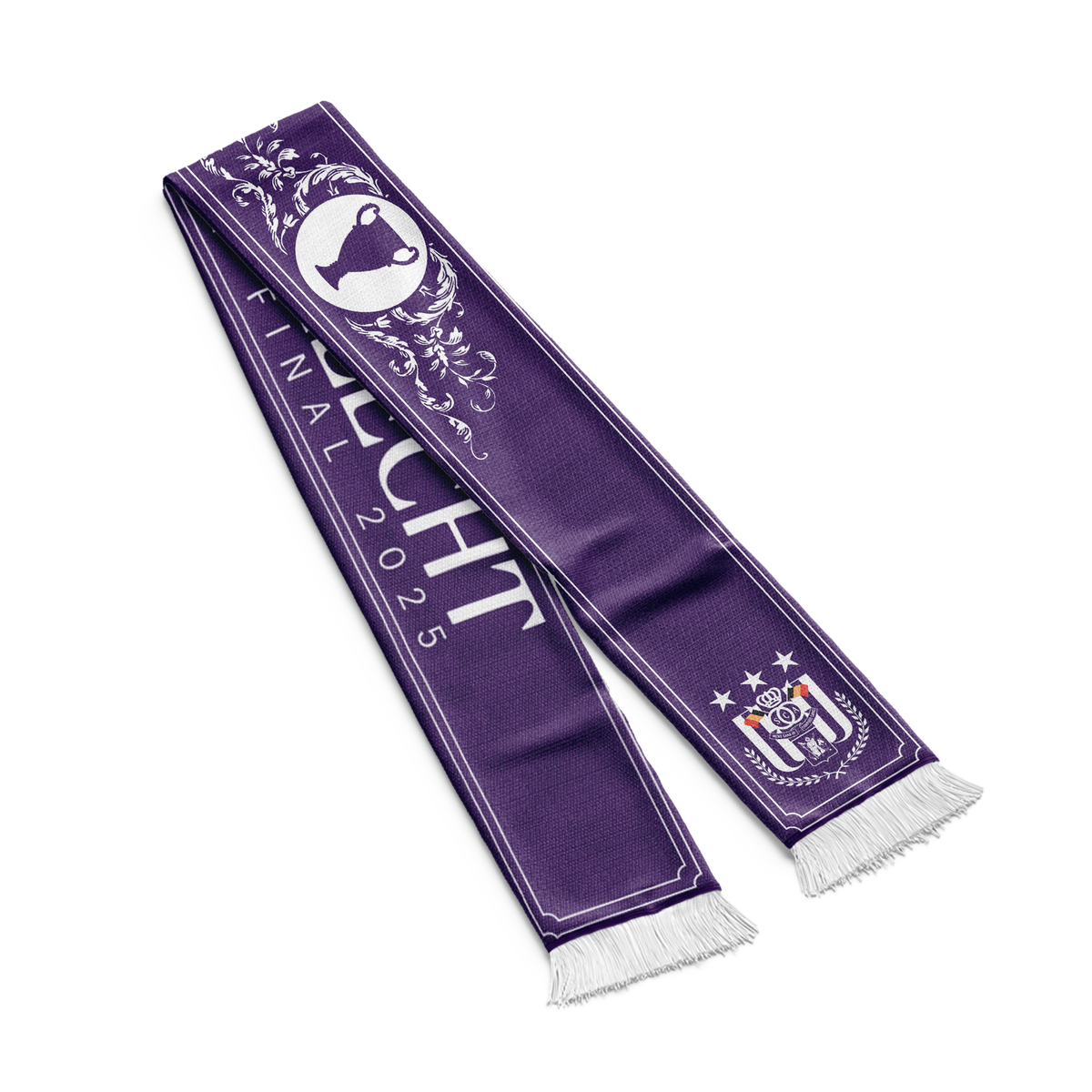 Collection Belgian Cup finale 2025. Écharpe mauve avec le crest RSCA et la Coupe de Belgique sur le recto, et l’inscription “RSC Anderlecht – Belgian Cup Finale” entourée d’un cadre Art Nouveau au verso.