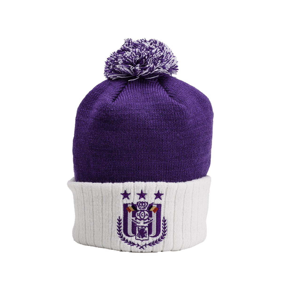 Paarse en Witte Muts, met het clublogo op de voorkant.