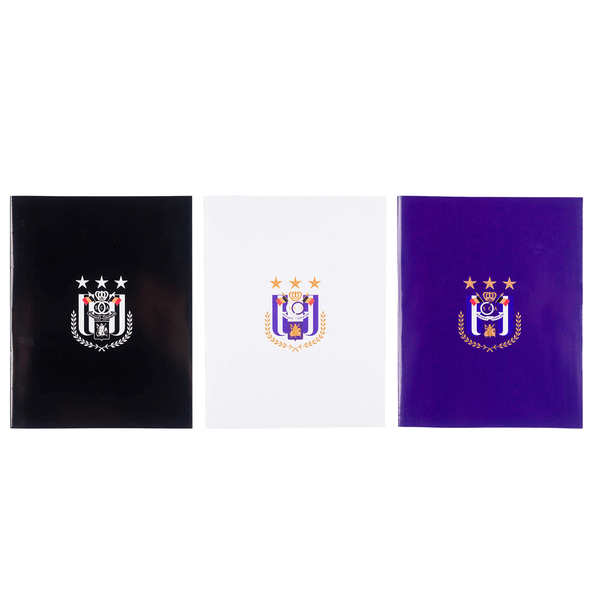 Set van 3 notitieboeken bedrukt met het logo van RSC Anderlecht op de voorkant.