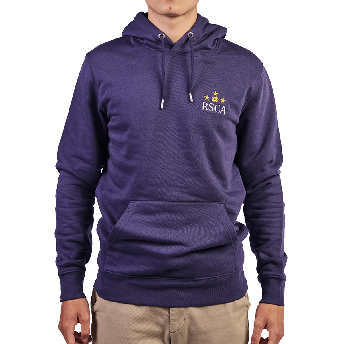 Paarse RSCA hoodie met verschillende Anderlecht referenties op de voorkant: RSCA, 3 sterren en een kroon.