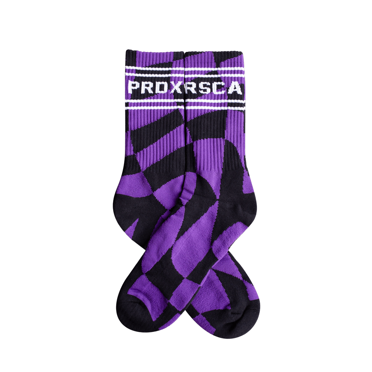 Mauve en zwarte sokken die de twee merken combineren met de witte “PRDXRSCA”-lettering op de enkel.